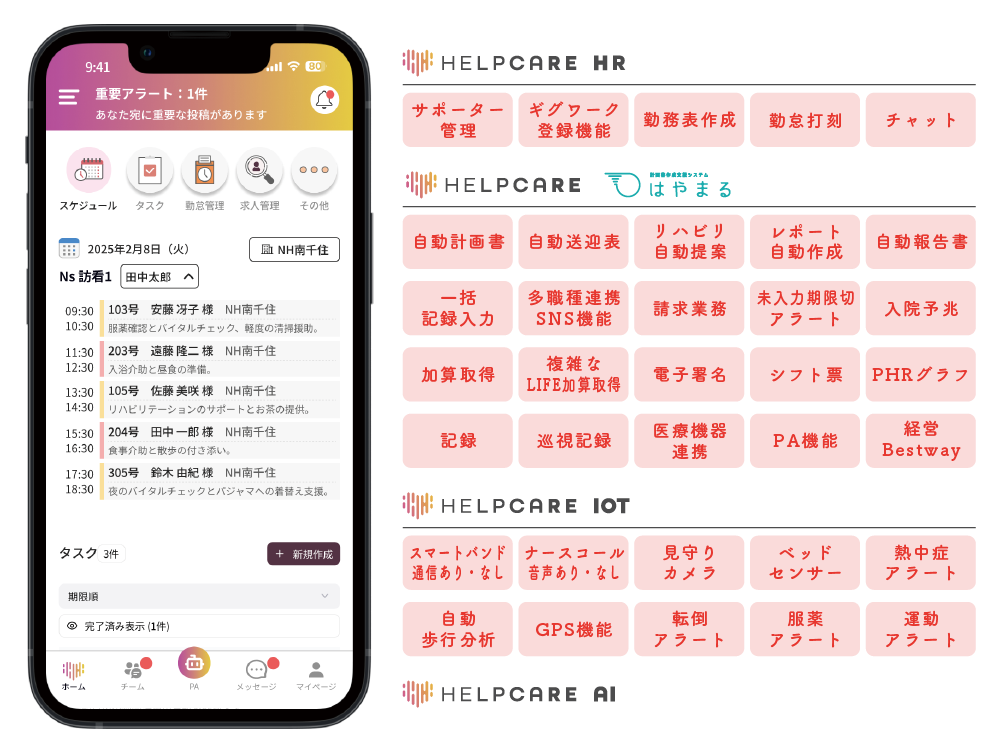 また、ITとAIによりご利用者様の「PHR(PersonalHealthRecord)」を管理することで状態悪化の予兆を早期に発見し対応し入院率を下げます。状態悪化に関しても質の高い集中介入により在宅生活の継続をご支援させて頂きます。