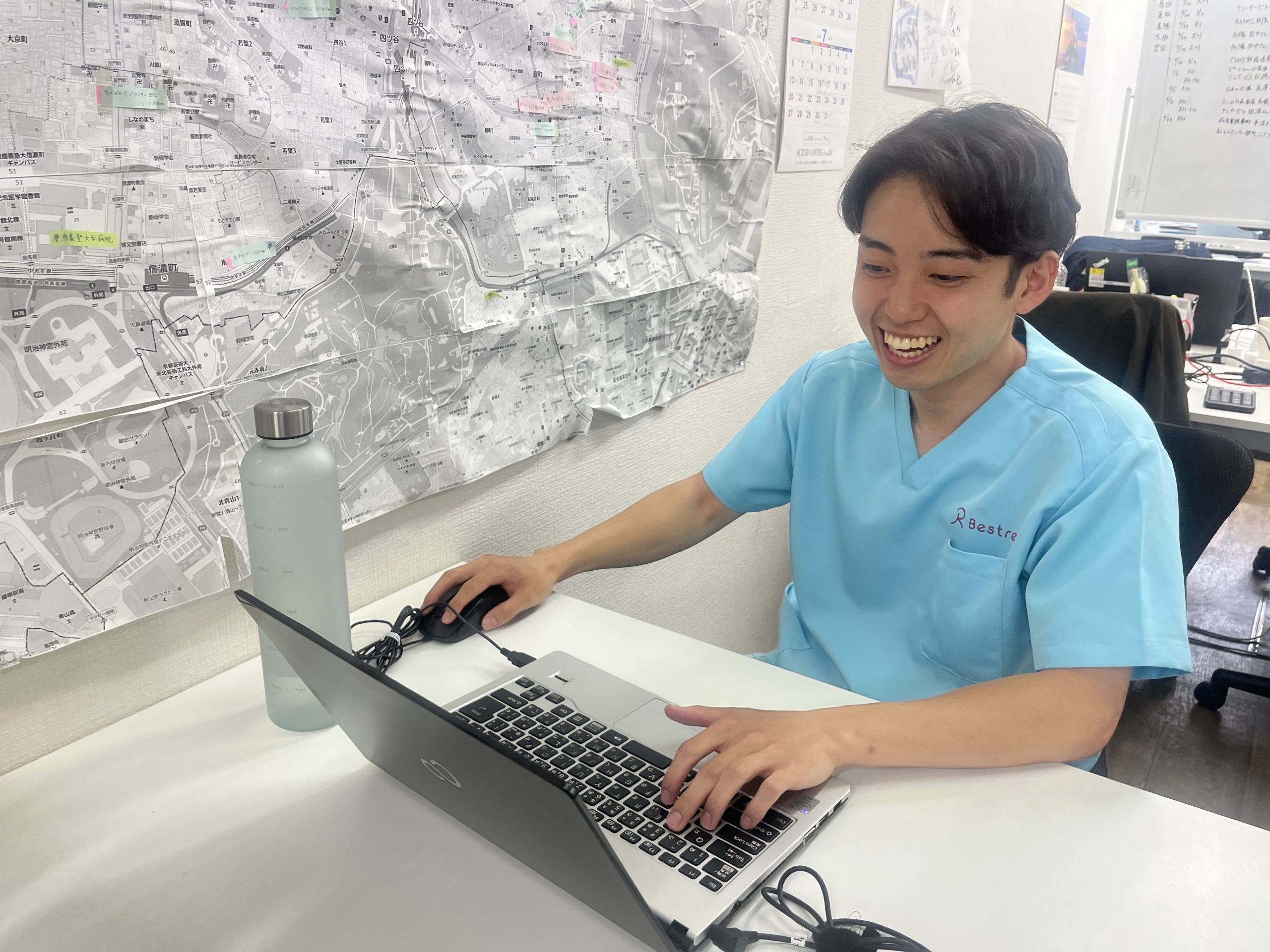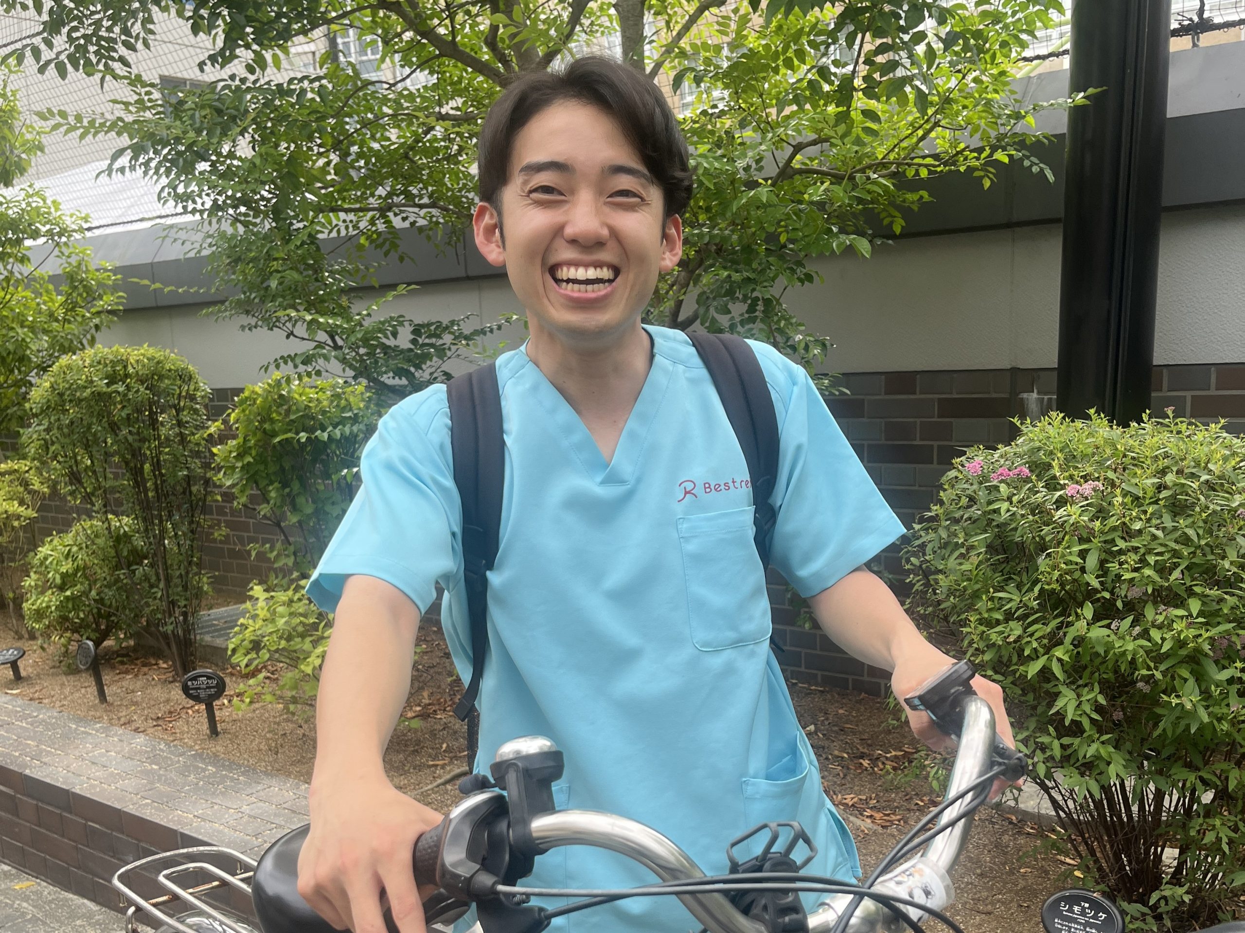 病院での実習や勤務を通して、退院後に自宅で過ごす患者様が再び転倒され、再入院してしまう姿を何度も目にしました。その度に「退院まではサポートできても、その後の生活はどう支えられるのだろう」と疑問を持ち、退院後の生活を支えるリハビリの重要性を強く意識するようになりました。そこから自然と訪問リハビリに興味を持つようになったのです。調べていく中で出会ったのがベストリハでした。訪問リハビリだけでなく、デイサービスや自社開発による新しい取り組みなど、幅広いサービスを展開していることを知り、利用者様の人生を多角的に支えられる可能性を感じました。「ここなら自分が目指しているリハビリができる」と確信し、入社を決意しました。